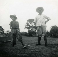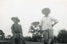 Muestra a un hombre y a un niño no identificados posando de pie y con sombrero en el campo en México.