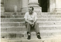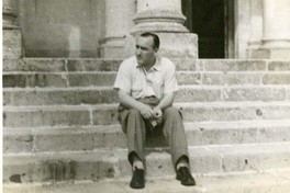 Muestra a Enrique Gajardo Villarroel sentado en los peldaños de la capilla de la Hacienda El Lencero en Xalapa, Veracruz (México).
