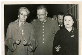 Gabriela Mistral a su llegada a Chile como invitada oficial, junto al Presidente Carlos Ibáñez y su esposa Graciela Letelier.
