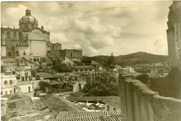 Muestra una vista general de la ciudad de Taxco en el Estado de Guerrero (México), en la que aparece parte del templo de Santa Prisca (incluyendo su cúpula).
