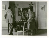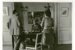 Pablo Neruda en su oficina junto a otras dos personas, en la Embajada de Chile en Francia.