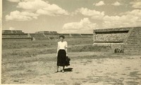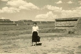 Muestra a Doris Dana posando de pie en medio del sitio arqueológico de Teotihuacán.
