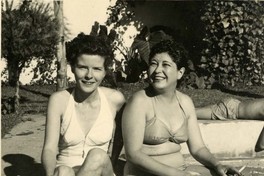 Doris Dana y una mujer no identificada en traje de baño sentadas en el borde de la piscina de Hotel Ruiz Galindo en Fortín de las Flores en Veracruz (México).