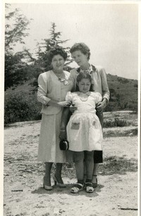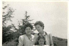 Doris Dana junto a una mujer y una niña no identificadas posando de pie al aire libre en una zona rural de México.
