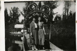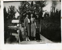 Doris Dana y una mujer no identificada en un bote en un canal en México, posando de pie debajo de un arco de flores que forma la palabra "LOLITA".