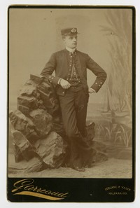 [Retrato de Joaquín Edwards Bello] [fotografía]. Valparaíso, Chile : [Garreaud, Leblanc y Valck], 1887. 1 fotografía : Sepia, formato cabinet, soporte: cartón, 16,2 x 10,4 cm/14 x 10,2cm .