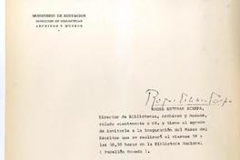 Invitación del Director de la Dirección de Bibliotecas, a la inauguración del Museo del Escritor, en la Biblioteca Nacional de Chile. Pide disculpas por la premura de la invitación.