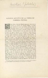 Algunos aspectos de la poesía de Gabriela Mistral [manuscrito] / Raúl Silva Castro. 4 hojas ; 25,3 x 16 cm. .