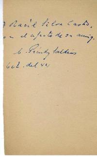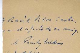 [Dedicatoria] 1944 octubre 6, Santiago, Chile [a] Raúl Silva Castro [manuscrito] / Carlos Préndez Saldías. 1 hoja ; 24 x 15 cm. .