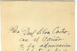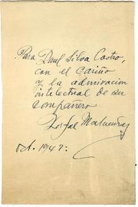 [Dedicatoria] 1942 octubre, Santiago, Chile [a] Raúl Silva Castro [manuscrito] / Rafael Maluenda. 1 hoja ; 19 x 12,5 cm. .