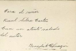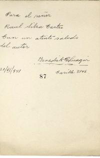 [Dedicatoria] 1941 junio 21, Santiago, Chile [a] Raúl Silva Castro [manuscrito] / Benedicto Chuaqui. 1 hoja ; 19 x 12 cm. .