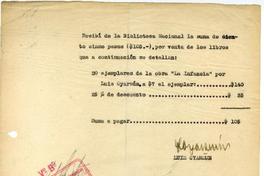 Recibo por la compra de veinte ejemplares del libro "La infancia".