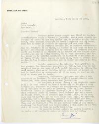 Lamenta que no pueda viajar a Londres. Comunica que envía la carta con una muchacha española Carmen Sartorius, quien se alojará en casa de Stella Moder en Santiago, espera que sea un buen amigo para ella.