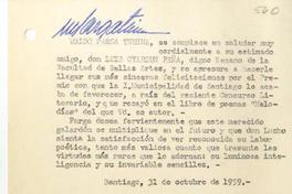 [Tarjeta] 1959 octubre 31, Santiago, Chile [a] Luis Oyarzún [manuscrito] Waldo Parga Turina.