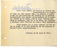 [Tarjeta] 1965 junio 24, Santiago, Chile [a] Luis Oyarzún [manuscrito] Waldo Parga Turina.