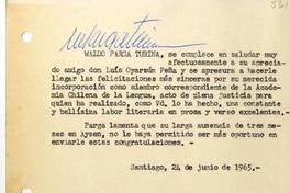 [Tarjeta] 1965 junio 24, Santiago, Chile [a] Luis Oyarzún [manuscrito] / Waldo Parga Turina. 1 tarjeta ; 14,7 x 12 cm. .