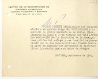 Tarjeta con membrete "Centro de Investigaciones de Historia Americana, Facultad de Filosofia y Educación, Universidad de Chile".