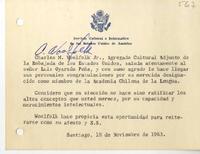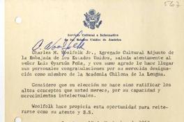 El agregado Cultural de la Embajada de los Estados Unidos lo saluda y felicita por su designación como miembro de la Academia Chilena de la Lengua.