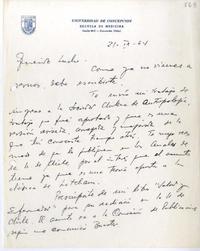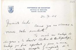 Le envía su trabajo de ingreso a la Sociedad Chilena de Antropología, para que lo publiquen en los Anales de la Universidad de Chile. Solicita que vea la reedición de su libro "Salud y enfermedad". Le informa que viajará a Europa y la Unión Soviética y que estará de regreso a fin de año.
