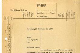[Carta] 1972 junio 19, Santiago, Chile [a] Luis Oyarzún [manuscrito] Luis Sánchez Latorre.