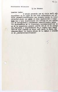 [Carta] [1970] febrero 15, [Buenos Aires, Argentina] [a] Luis Oyarzún [manuscrito] / Ernesto Sábato. 1 hoja ; 22 x 14 cm. .