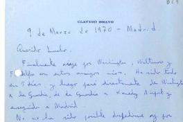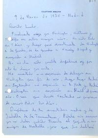 [Carta] 1970 marzo 9, Madrid, España [a] Luis Oyarzún [manuscrito] Claudio Bravo.