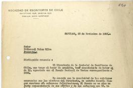 Lo felicita a nombre de la Sociedad de Escritores de Chile, por haber obtenido el Premio Nacional de Teatro.