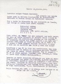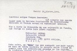 [Carta] 1974 diciembre 12, Madrid, España [a] Luis Vargas Saavedra, Santiago, Chile [manuscrito] / Luis Vargas Saavedra. 1 hoja ; 29,4 x 20,2 cm. .