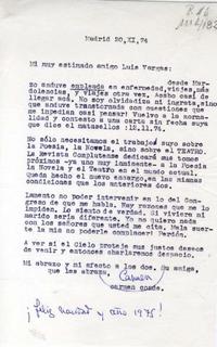 [Carta] 1974 noviembre 20, España, Madrid [a] Luis Vargas Saavedra, Santiago, Chile [manuscrito] / Luis Vargas Saavedra 1 hoja ; 27 x 13,3 cm. .