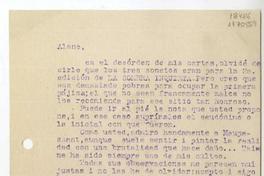Le comenta sobre unos sonetos para la segunda edición de "La sombra inquieta". Habla de su admiración por [Guy de] Maupassant y [Hippolyte]Taine y le recomienda que lea el "Canto al Señor" de Rabindranath Tagore