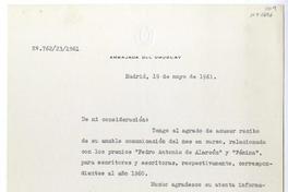 El primer Secretario de la Embajada de Uruguay, comunica que dará amplia difusión de los Premios "Fémina" y "Pedro Antonio de Alarcón".