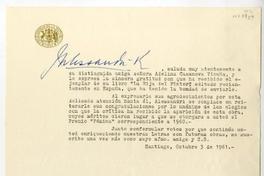 Santiago, Chile [a] Adelina Casanova Vicuña Tarjeta, 1961 octubre 3, [manuscrito] Jorge Alessandri Rodríguez.