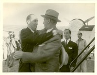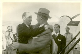 Juan Marin saludando a su llegada a San Salvador al Presidente Juan Antonio Ríos, ambos en visita oficial en El Salvador.