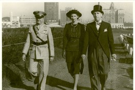 Juan Marín junto a su esposa Milena y un oficial no identificado durante la Revista Militar en honor de Chile, realizada en el Roce Club por el Cuarto Regimiento U.S. Marines" en Shanghai, China.