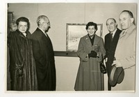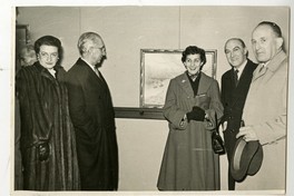 Adelina Casanova Vicuña con Jorge Vidal de la Fuente, su hermano y pintor Manuel Casanova Vicuña junto a otras personas no identificadas en una exposición de cuadros del pintor en el Palacio La Alhambra en Santiago, en agosto de 1955.