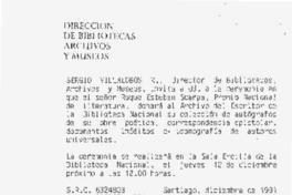 Santiago, Chile [a] Roque Esteban Scarpa Invitación, 1991 diciembre 12, [manuscrito] Sergio Villalobos.