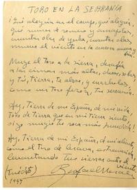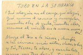 Toro en la serranía [manuscrito] / Rafael Morales. 1 hoja ; 21,5 x 15,5 cm. .