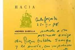 Antofagasta, Chile [a] Roque Esteban Scarpa Carta, 1976 febrero 25, [manuscrito] / Andrés Sabella. 1 hoja ; 21,5 x 13,5 cm. .