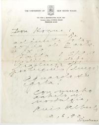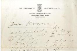 Hológrafo a tinta, firmado. Con membrete "The University of New South Wales".