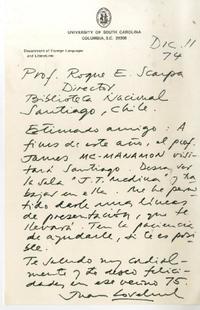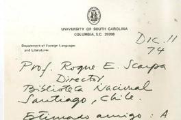 Columbia, South Carolina [a] Roque Esteban Scarpa Carta, 1974 diciembre 11, [manuscrito]. Juan Loveluck.