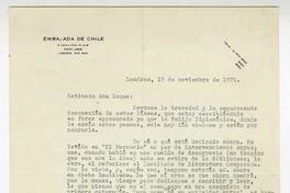 Londres, Inglaterra [a] Roque Esteban Scarpa Carta, 1971 noviembre 19, [manuscrito] / Hernán Montealegre. 1 hoja ; 25,5 x 20,5 cm. .