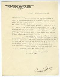 Linares, Chile [a] Roque Esteban Scarpa Carta, 1976 noviembre 5, [manuscrito] / Pedro Olmos. 1 hoja ; 21,5 x 27 cm. .