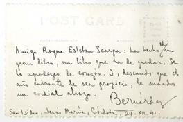 Córdoba, Argentina [a] Roque Esteban Scarpa Tarjeta postal, 1941 diciembre 24, [manuscrito] Francisco Luis Bernárdez.