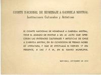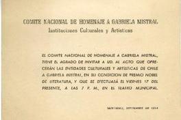 Invitación a un acto cultural y artístico en homenaje a Gabriela Mistral, en su condición de premio Nobel, en el Teatro Municipal, el día 17 de septiembre de 1954.