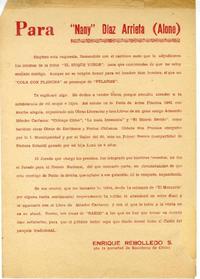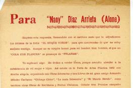 Para "Nany" Díaz Arrieta (Alone) / Enrique Rebolledo Sánchez. [Santiago de Chile : Enrique Rebolledo , 1963.] 1 hoja ; 27,5 x 19 cm. .