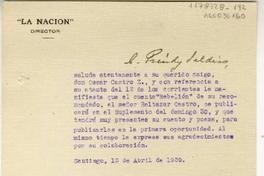 Santiago, Chile [a] Oscar Castro, Rancagua Carta, 1939 abril 13, [manuscrito] Carlos Préndez Saldías.