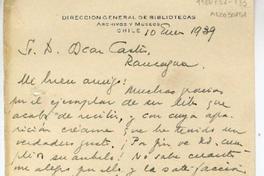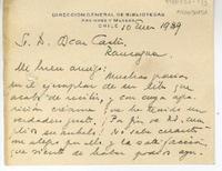 Santiago, Chile [a] Oscar Castro, Rancagua Tarjeta, 1939 enero 10, [manuscrito] Ernesto Galliano.