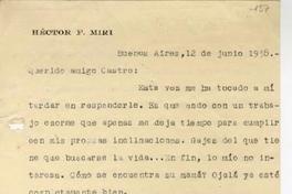 Buenos Aires, Argentina [a] Oscar Castro, Rancagua, Chile Carta, 1938 junio 12, [manuscrito] / Héctor Fuad Miri. 1 hoja ; 20 x 16 cm. .