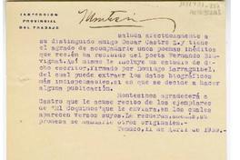 Temuco, Chile [a] Oscar Castro Tarjeta, 1939 abril 11, [manuscrito] / Néstor Montesinos H. 1 tarjeta ; 10 x 14 cm. .