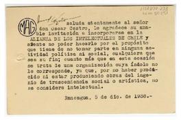 Agradece su invitación a incorporarse a la Alianza de los intelectuales, pero lamenta no poder hacerlo por no querer formar parte de ninguna actividad política ni social y tampoco se considera un intelectual por no tener una producción artística o social.